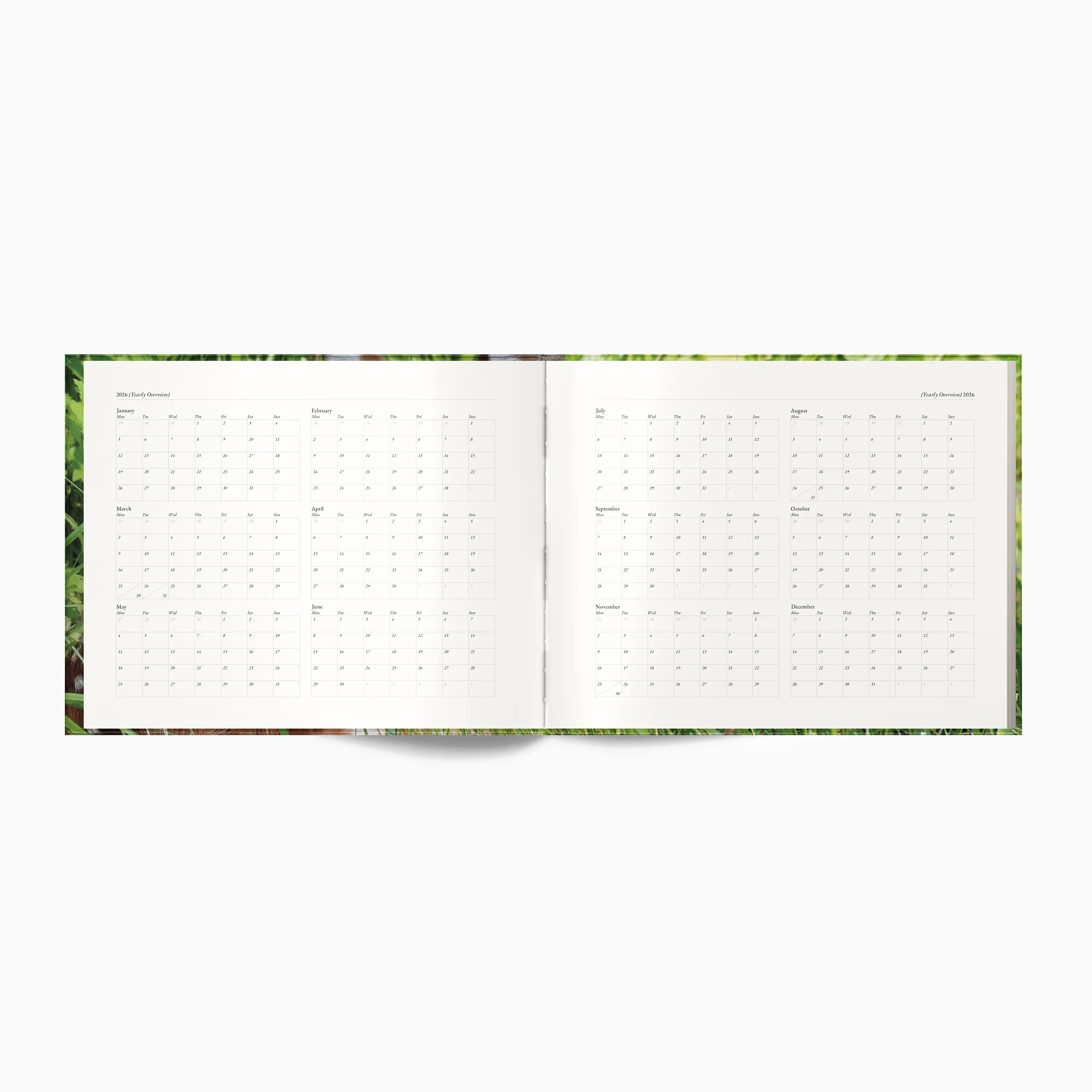 Our hardcover planners feature yearly and monthly overviews, with a weekly layout designed for hour-by-hour scheduling. Our paper is FSC certified, lead-free, acid-free, buffered, and made from wood-based pulp.