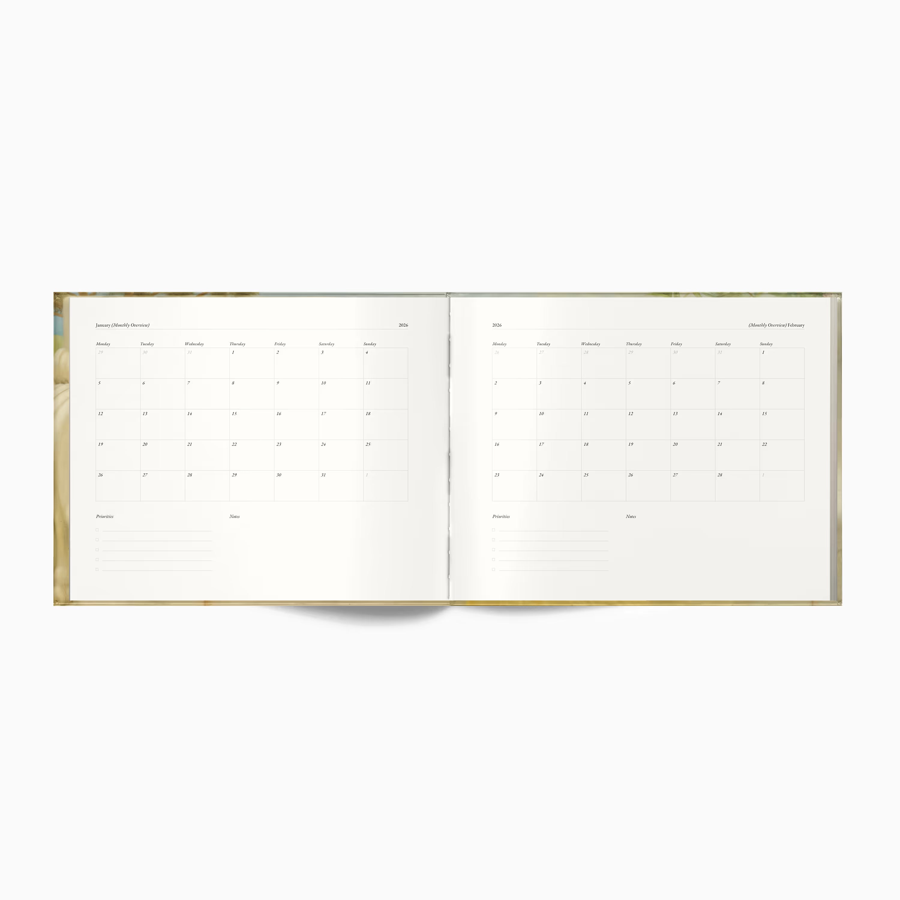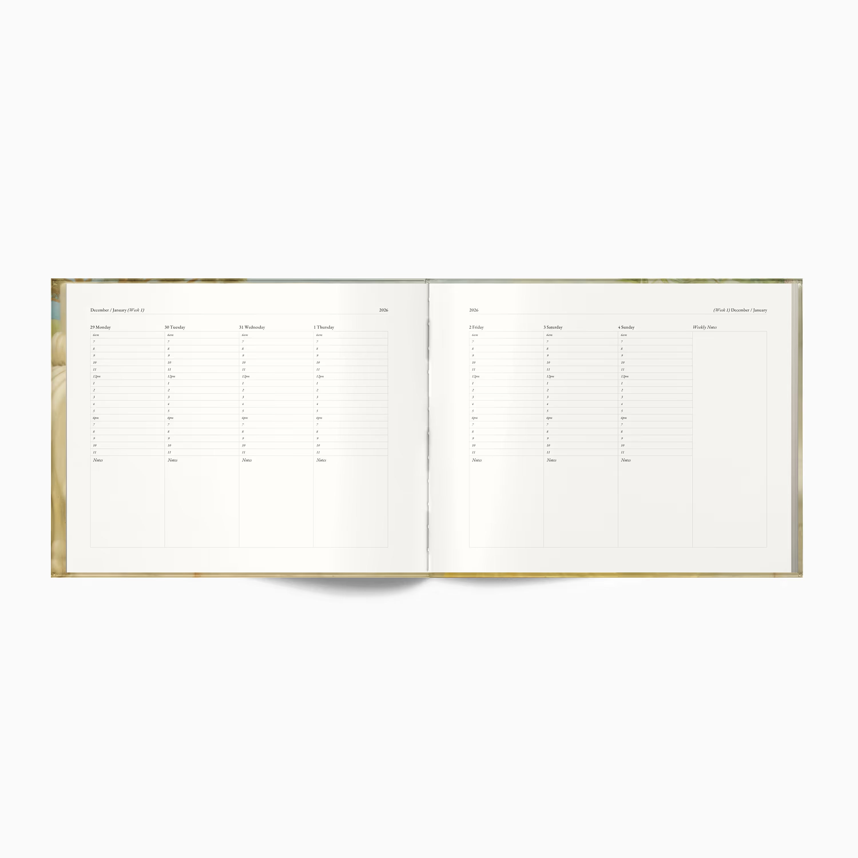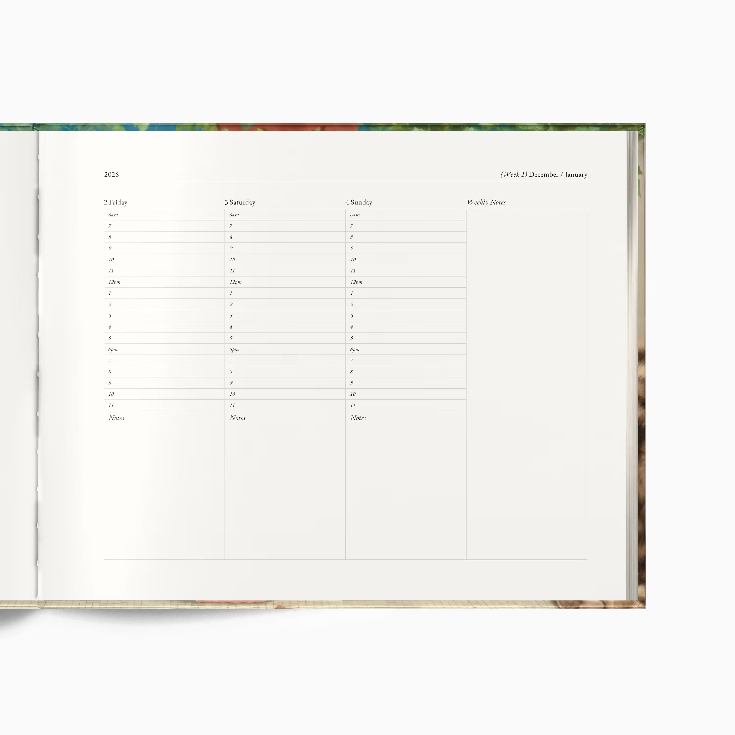Our hardcover planners feature yearly and monthly overviews, with a weekly layout designed for hour-by-hour scheduling. Our paper is FSC certified, lead-free, acid-free, buffered, and made from wood-based pulp.
