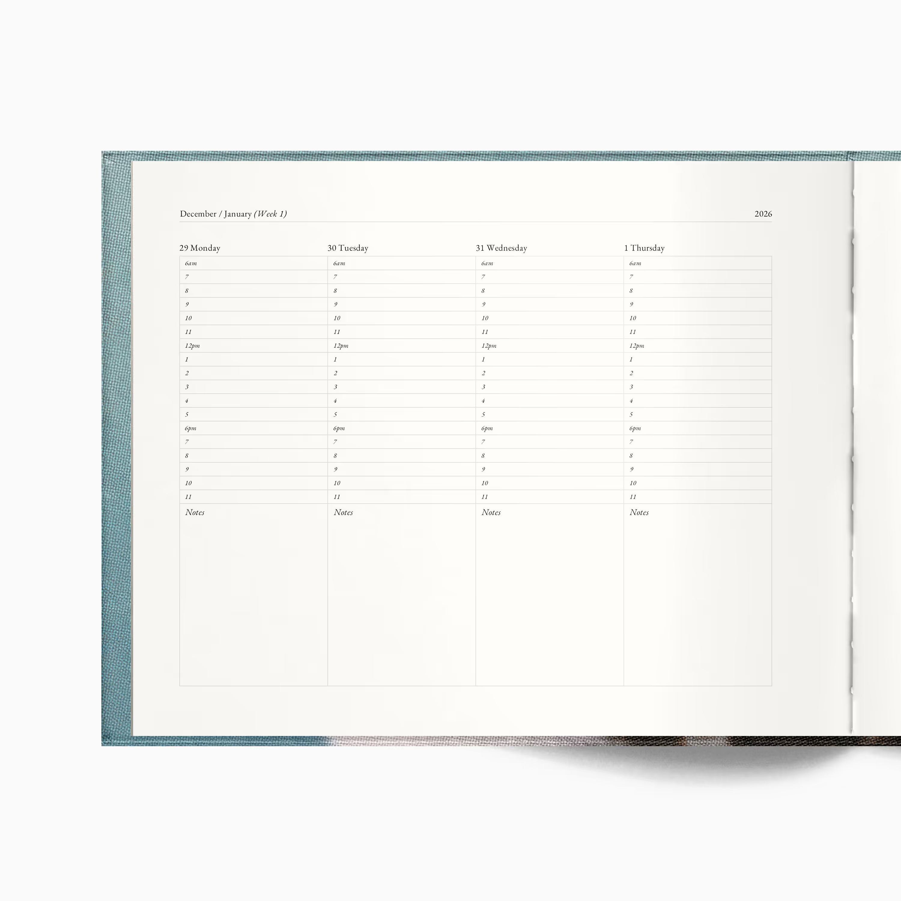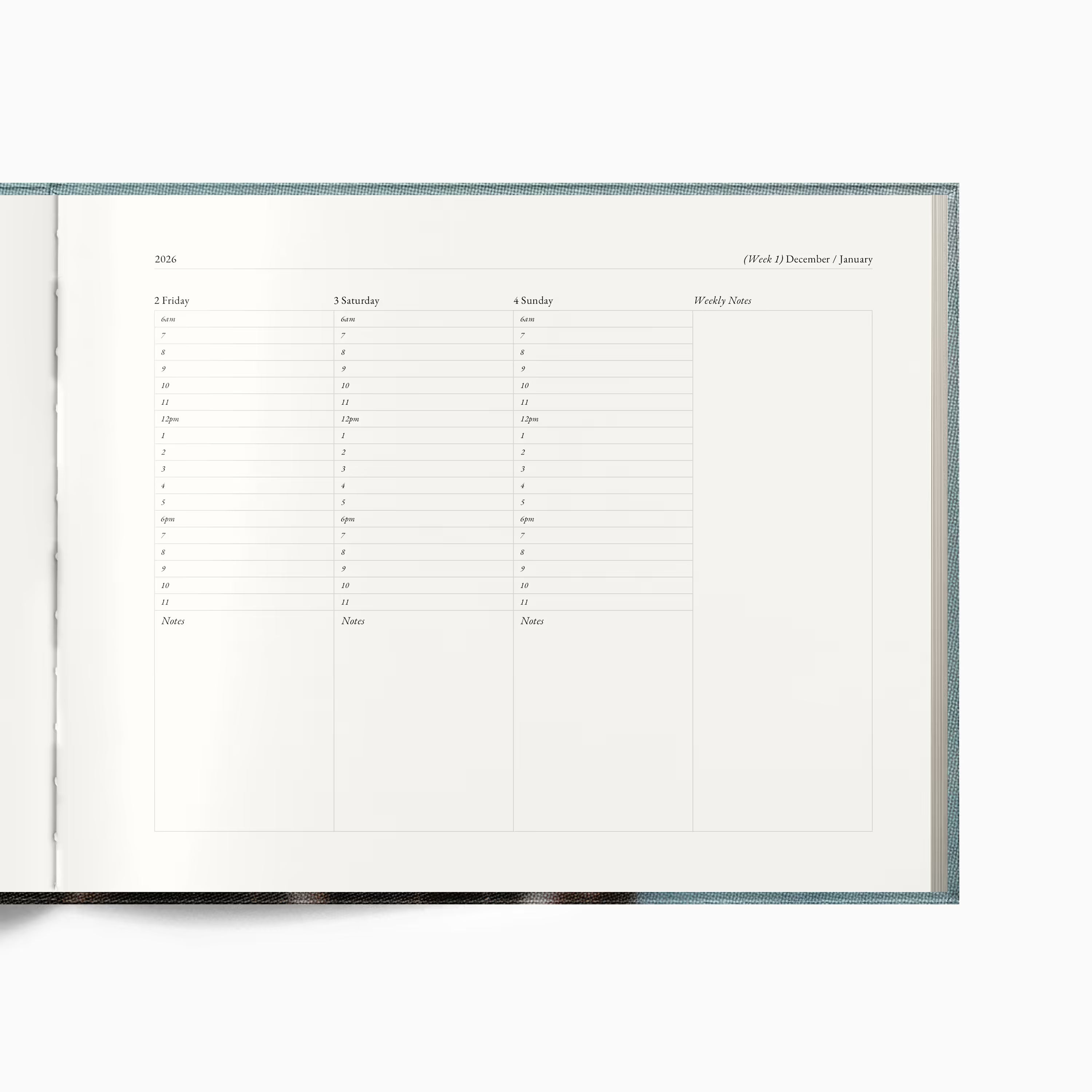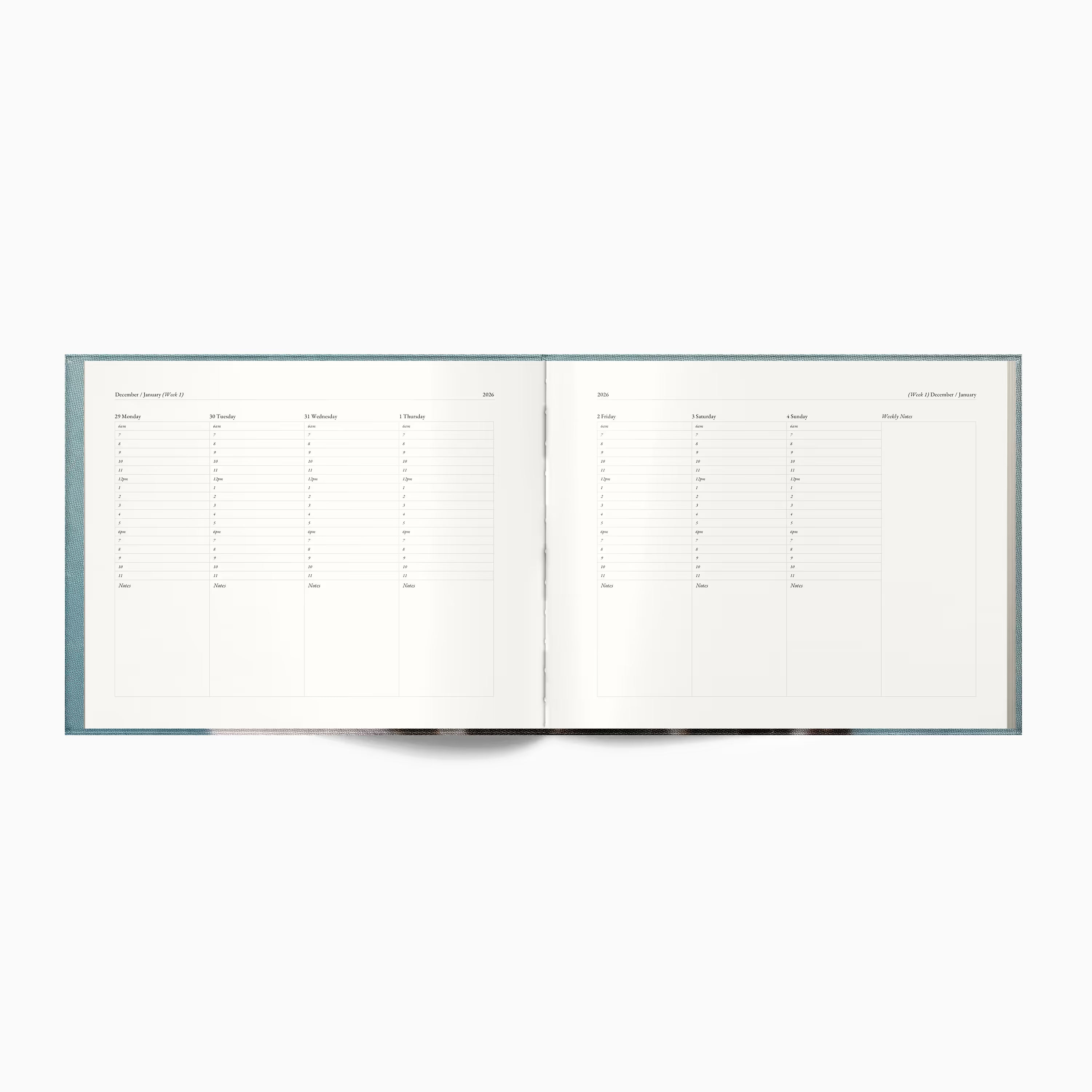 Dated planner featuring a weekly layout designed for hour-by-hour scheduling. Includes yearly and monthly overviews. Paper is FSC certified, lead-free, acid-free, buffered, and made from wood-based pulp.