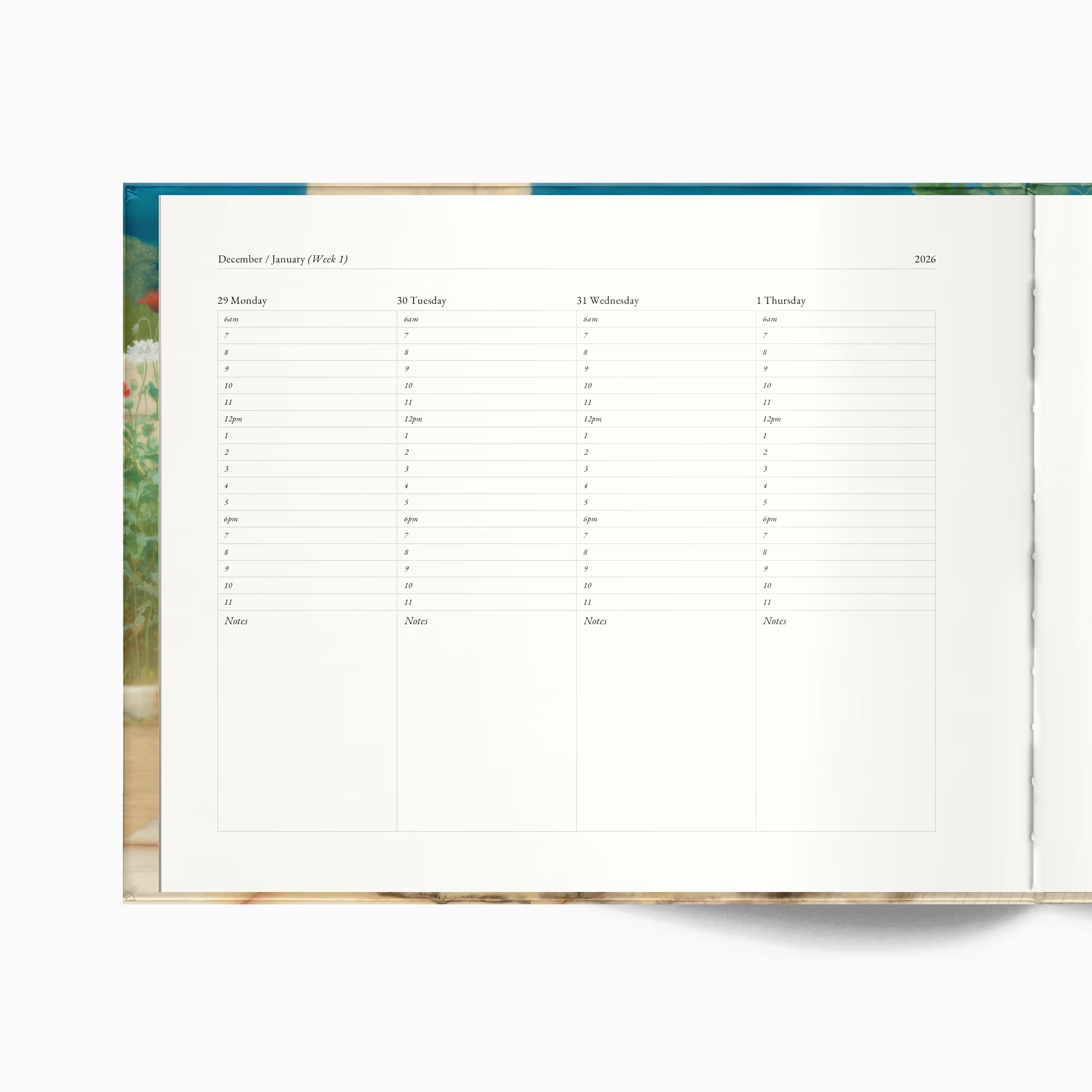 Our hardcover planners feature yearly and monthly overviews, with a weekly layout designed for hour-by-hour scheduling. Our paper is FSC certified, lead-free, acid-free, buffered, and made from wood-based pulp.